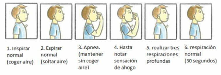 - Realiza 30-40 respiraciones rápidas y profundas, inhala y exhala en intervalos cortos y acelerados.